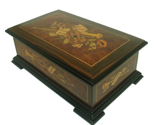 Exquisite Wood Tone Music Box with Musical and Flower Theme Inlay?Simply one of the most amazing music boxes available today, 72 note Reuge Musical box with a beautiful dark wood matte finish design, made by the best artists in the world. A beautiful hand made wooden music box with attractive styling and perfect, lowest price for a 72 note movement. This is a genuine Reuge Music Box Company music box with a flawless Swiss 3 part 72 note movement, the real deal. The box is one of the grand pieces from the gorgeous Reuge Music Box collection and only portrays beauty and top quality. The wood is natural, solid and has the most gorgeous dark matte finish. An on/off switch is included for your convenience and for appropriate start and stopping of the song. Each and every piece is hand made to perfection and will bring peace and harmony to any home, and will make the most prestige and one of a kind gift for a lifetime. The 72 note movement plays for 10 minutes and produces the highest quality sounds. Your satisfaction is always guaranteed at The Attic, let us know what we can do for you..... Reason for the "Attic's Biggest Mark Down": Dimensions: Length - 10"Width - 6.75"Height - 4"Masterpiece Music Box!