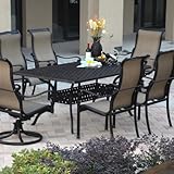 Darlee Monterey Sling Patio Dining Set - Seats 6Darlee Monterey Sling Patio Dining Set - Seats 6. MY10-1-3-7-S30RE-AB. Aluminum Patio Dining Sets. This patio dining set seats 6 and features the distinctive sling styling and unique accents of the Monterey collection. The cast aluminum frame weighs less than wrought iron, and is rust resistant. Sling material dries quickly, making it ideal for the poolside. The antique bronze finish is powder coated, making it tougher than conventional paint finishes. This outdoor dining set features Irish Mix sling fabric color. Dimensions (in inches): Dining Table: 42 W x 72 D x 29 H. Dining Chair: 28 W x 29 D x 44 H. Dining Chair Seat Height: 17 1/2. Dining Chair Arm Height: 25 1/2. Swivel Rocker: 28 W x 29 D x 44 H. Swivel Rocker Seat Height: 17 1/2. Swivel Rocker Arm Height: 25 1/2.