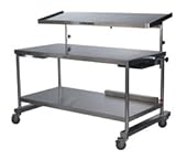 Pedigo Space Station Central Supply Work Table 30" D x 60" W x 34" H. A specialty table designed with additional space for large, instrument and equipment intensive cases such as orthopedics, spinal fusion and craniotomy.Features:A top, cantilevered shelf holds multiple trays and is angled 10 degrees for easy observation of instruments with an adjustable height range from 49.9" to 52.9"The shelf is easily raised when extra space is required, or lowered into its storage position if not neededPneumatic assist enables one-person operation in raising or lowering the shelfStrong, heavy-duty, all stainless steel constructionEasily moved into position with 4" diameter, heavy-duty all ball bearing castersStays where needed with single-pedal caster locks that engage both brake locks and swivel locks on each casterA single-piece disposable drape is available that covers both surfaces of the sterile field (sold separately, please see "Accessories for this Product" below.)Dimensions:Main Table: 30" D x 60" W x 34" HTop Shelf: 20"D x 60" WShelf weight capacity:Bottom shelf: 230 lbs.; Middle Shelf: 230 lbs.; Top Shelf: 160 lbs.3 Year Warranty against manufacturing defectsThis item ships via Motor Freight Carrier. The shipping fees quoted at checkout are based on your indication of your shipping location's loading dock status and do NOT include inside delivery of any kind. It is required to indicate a contact name & phone number for the person responsible for the delivery as well as the loading dock or receiving hours. Other delivery services or special instructions can also be entered in the text field provided. If additional services necessitate an additional fee, you will be contacted by Customer Service prior to order finalization. If you have questions about the motor freight delivery process contact Customer Service prior to placing your order.Pedigo utilizes 18 & 16 gauge, corrosion resistant, austenitic grade stainless steel in construction of all of their stainless steel items