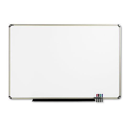 | Quartet® - Euro Frame Dry-Erase Board, Porcelain/Steel, 72 x 48, White/Aluminum Frame - Sold As 1 Each - Complement your workspace with modern EuroTM styling while improving communication with this Prestige Plus® porcelain dry-erase board. #Quartet® - Euro Frame Dry-Erase Board, Porcelain/Steel, 72 x 48, White/Aluminum Frame Complement your workspace with modern EuroTM styling while improving communication with this high-performance porcelain dry-erase board. Ideal for high-profile conference rooms, executive offices and other heavy-use environments, this top-quality board ensures exceptional performance with top-of-the-line DuraMax® Porcelain that will not scratch or dent. The Total Erase® surface will not stain or ghost, ensuring clear and effective communication for years to come. For added versatility, the steel-backed porcelain creates a magnetic surface, doubling its uses as a bulletin board. Also makes a great projection screen. An aluminum frame with titanium finish surrounds all sides of the Total Erase® surface for sleek styling and maximum durability. An easy-to-use corner cap mounting system holds the board tightly to the wall in four places. The board comes complete with attached marker tray, Quick Clips for easily posting documents and four Quartet® dry-erase markers. Board Type: Dry Erase;Magnetic; Board Width: 72"; Board Height: 48". - Board Height: 48"
